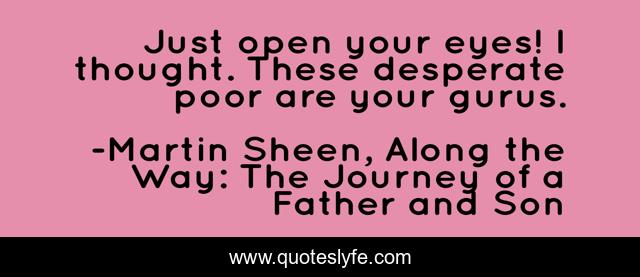 This page presents the quote "Just open your eyes! I thought. These desperate poor are your gurus.". Author of this quote is Martin Sheen, Along the Way: The Journey of a Father and Son. This quote is about discipleship, learning,.