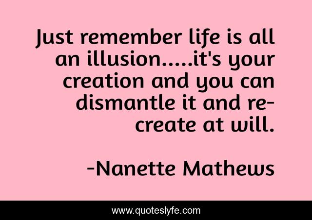 This page presents the quote "Just remember life is all an illusion.....it's your creation and you can dismantle it and re-create at will.". Author of this quote is Nanette Mathews. This quote is about perception, create-your-life, creation, create-your-reality, thoughts-become-things, create-your-world, inspirational, enthusiasm, illusion,.
