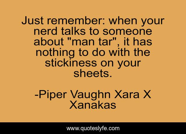 This page presents the quote "Just remember: when your nerd talks to someone about "man tar", it has nothing to do with the stickiness on your sheets.". Author of this quote is Piper Vaughn Xara X Xanakas. This quote is about laughed-out-loud, hilarious,.