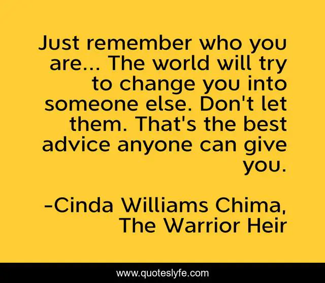 This page presents the quote "Just remember who you are... The world will try to change you into someone else. Don't let them. That's the best advice anyone can give you.". Author of this quote is Cinda Williams Chima, The Warrior Heir. .