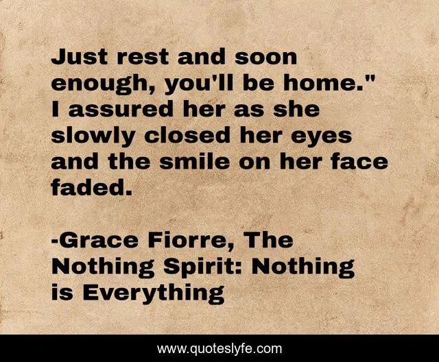 This page presents the quote "Just rest and soon enough, you'll be home." I assured her as she slowly closed her eyes and the smile on her face faded.". Author of this quote is Grace Fiorre, The Nothing Spirit: Nothing is Everything. This quote is about home, reassurance, rest,.