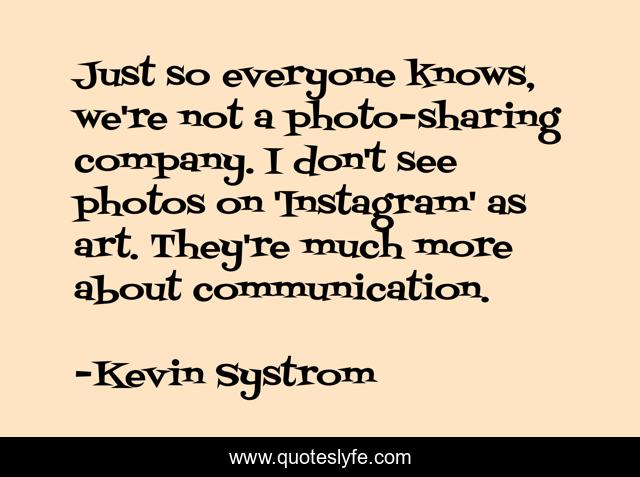 This page presents the quote "Just so everyone knows, we're not a photo-sharing company. I don't see photos on 'Instagram' as art. They're much more about communication.". Author of this quote is Kevin Systrom. This quote is about company, art, see,.