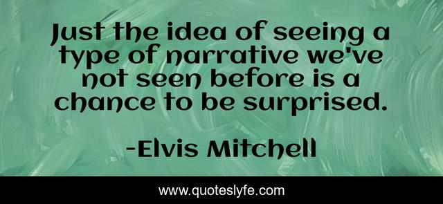 This page presents the quote "Just the idea of seeing a type of narrative we've not seen before is a chance to be surprised.". Author of this quote is Elvis Mitchell. This quote is about seeing, idea, just,.