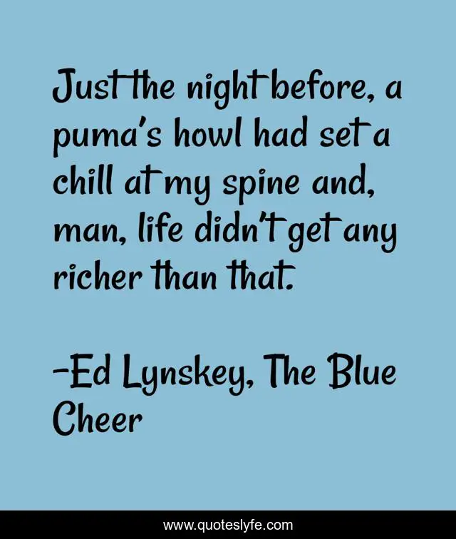 This page presents the quote "Just the night before, a puma’s howl had set a chill at my spine and, man, life didn’t get any richer than that.". Author of this quote is Ed Lynskey, The Blue Cheer. This quote is about mystery, detective-novel, noir, crime-fiction, romance, suspense, adventure, hardboiled, thriller,.