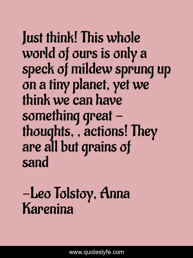 This page presents the quote "Just think! This whole world of ours is only a speck of mildew sprung up on a tiny planet, yet we think we can have something great - thoughts, , actions! They are all but grains of sand". Author of this quote is Leo Tolstoy, Anna Karenina. This quote is about leo-tolstoy, anna-karenina, life, life-philosophy,.