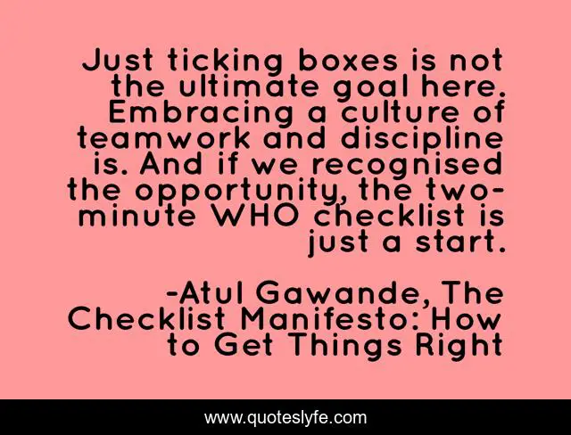 This page presents the quote "Just ticking boxes is not the ultimate goal here. Embracing a culture of teamwork and discipline is. And if we recognised the opportunity, the two-minute WHO checklist is just a start.". Author of this quote is Atul Gawande, The Checklist Manifesto: How to Get Things Right. .
