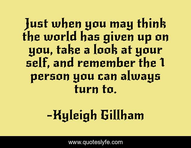 This page presents the quote "Just when you may think the world has given up on you, take a look at your self, and remember the 1 person you can always turn to.". Author of this quote is Kyleigh Gillham. This quote is about love, affection, inspiration,.