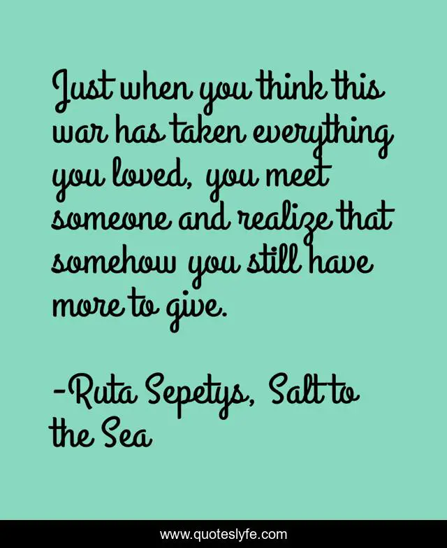 This page presents the quote "Just when you think this war has taken everything you loved, you meet someone and realize that somehow you still have more to give.". Author of this quote is Ruta Sepetys, Salt to the Sea. This quote is about world-war-ii, war,.