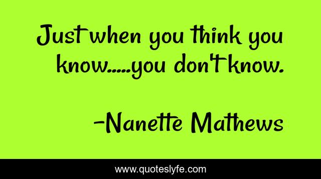 This page presents the quote "Just when you think you know.....you don't know.". Author of this quote is Nanette Mathews. This quote is about change-your-mind, perception, intelligence, wisdom, inspirational, enthusiasm, illusion,.
