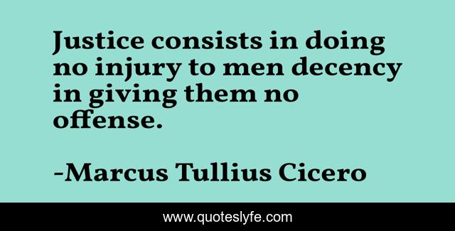 This page presents the quote "Justice consists in doing no injury to men decency in giving them no offense.". Author of this quote is Marcus Tullius Cicero. This quote is about justice, giving, legal,.