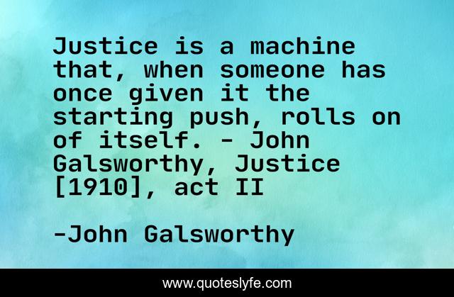 This page presents the quote "Justice is a machine that, when someone has once given it the starting push, rolls on of itself. - John Galsworthy, Justice [1910], act II". Author of this quote is John Galsworthy. .