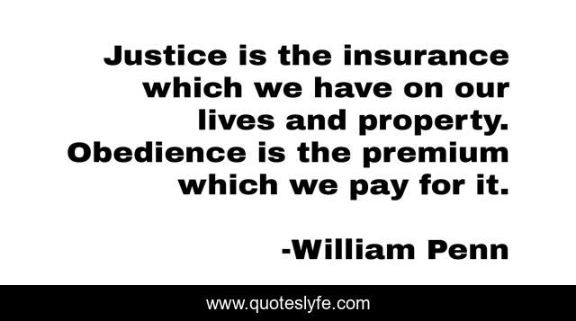 This page presents the quote "Justice is the insurance which we have on our lives and property. Obedience is the premium which we pay for it.". Author of this quote is William Penn. .