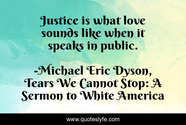 This page presents the quote "Justice is what love sounds like when it speaks in public.". Author of this quote is Michael Eric Dyson, Tears We Cannot Stop: A Sermon to White America. This quote is about christian, justice, race, love, civil-rights, affection,.