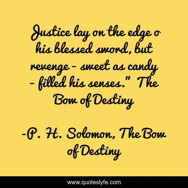 This page presents the quote "Justice lay on the edge o his blessed sword, but revenge - sweet as candy - filled his senses." The Bow of Destiny". Author of this quote is P. H. Solomon, The Bow of Destiny. This quote is about fantasy, fantasy-books, fantasy-fiction, fantasy-series,.
