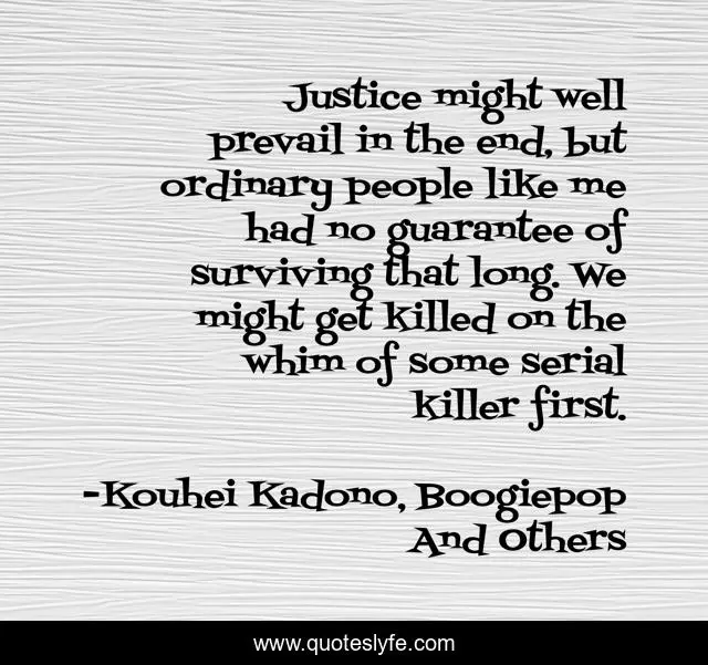 This page presents the quote "Justice might well prevail in the end, but ordinary people like me had no guarantee of surviving that long. We might get killed on the whim of some serial killer first.". Author of this quote is Kouhei Kadono, Boogiepop And Others. This quote is about justice, survive, killer, murder,.