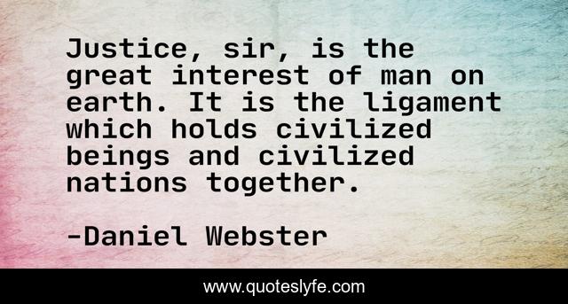 This page presents the quote "Justice, sir, is the great interest of man on earth. It is the ligament which holds civilized beings and civilized nations together.". Author of this quote is Daniel Webster. This quote is about justice, great, together,.