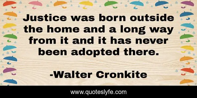 This page presents the quote "Justice was born outside the home and a long way from it and it has never been adopted there.". Author of this quote is Walter Cronkite. .