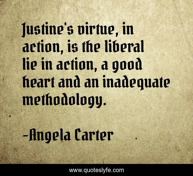 This page presents the quote "Justine's virtue, in action, is the liberal lie in action, a good heart and an inadequate methodology.". Author of this quote is Angela Carter. This quote is about liberal, virtue,.