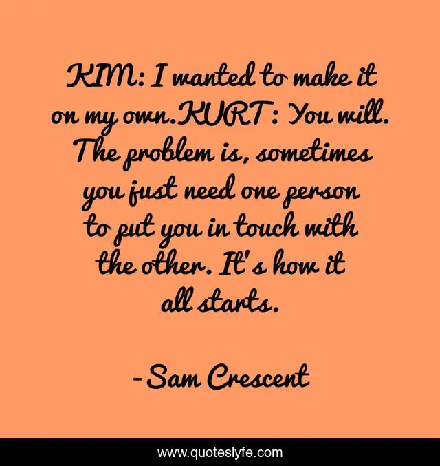 This page presents the quote "KIM: I wanted to make it on my own.KURT: You will. The problem is, sometimes you just need one person to put you in touch with the other. It’s how it all starts.". Author of this quote is Sam Crescent. This quote is about romance, erotic-romance,.