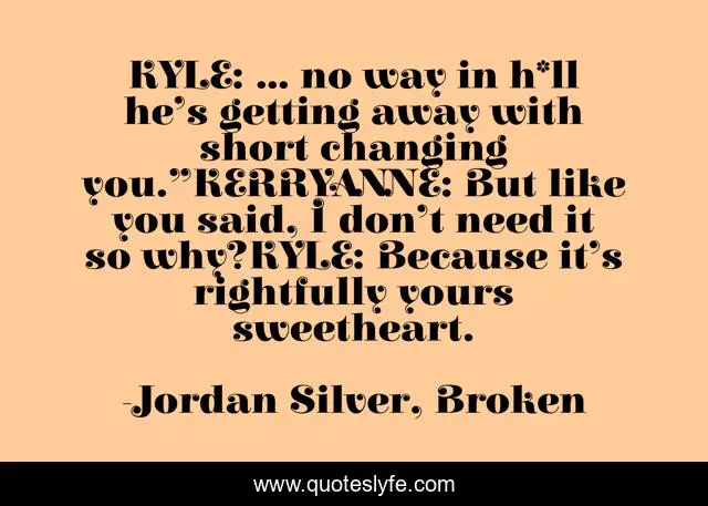 This page presents the quote "KYLE: ... no way in h*ll he’s getting away with short changing you.”KERRYANNE: But like you said, I don’t need it so why?KYLE: Because it’s rightfully yours sweetheart.". Author of this quote is Jordan Silver, Broken. This quote is about romance, erotic-romance, self-help,.
