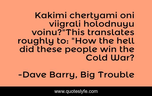 This page presents the quote "Kakimi chertyami oni viigrali holodnuyu voinu?"This translates roughly to: "How the hell did these people win the Cold War?". Author of this quote is Dave Barry, Big Trouble. This quote is about big, cold, war, trouble, russia,.