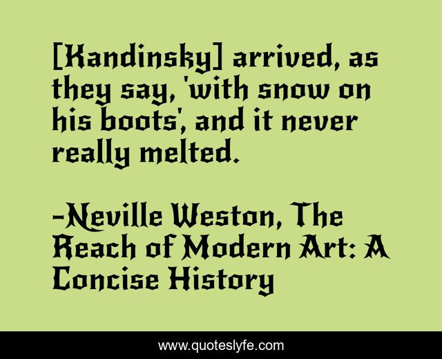 This page presents the quote "[Kandinsky] arrived, as they say, 'with snow on his boots', and it never really melted.". Author of this quote is Neville Weston, The Reach of Modern Art: A Concise History. .