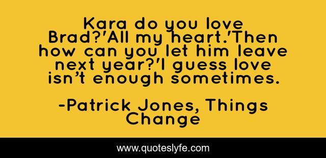 This page presents the quote "Kara do you love Brad?'All my heart.'Then how can you let him leave next year?'I guess love isn’t enough sometimes.". Author of this quote is Patrick Jones, Things Change. This quote is about heartbreak, love, affection,.