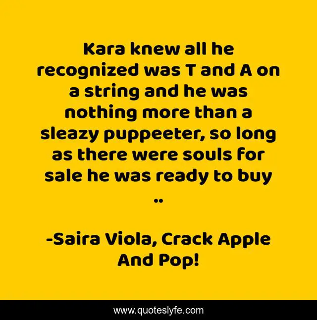 This page presents the quote "Kara knew all he recognized was T and A on a string and he was nothing more than a sleazy puppeeter, so long as there were souls for sale he was ready to buy ..". Author of this quote is Saira Viola, Crack Apple And Pop!. This quote is about satire, hot-crime, fiction,.