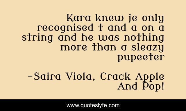 This page presents the quote "Kara knew je only recognised t and a on a string and he was nothing more than a sleazy pupeeter". Author of this quote is Saira Viola, Crack Apple And Pop!. This quote is about crime-fiction, satire,.