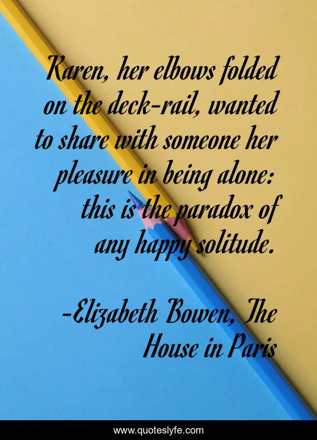 This page presents the quote "Karen, her elbows folded on the deck-rail, wanted to share with someone her pleasure in being alone: this is the paradox of any happy solitude.". Author of this quote is Elizabeth Bowen, The House in Paris. This quote is about solo, solo-travel, solitude, solitude-as-a-choice, solo-traveler, solo-journeys,.