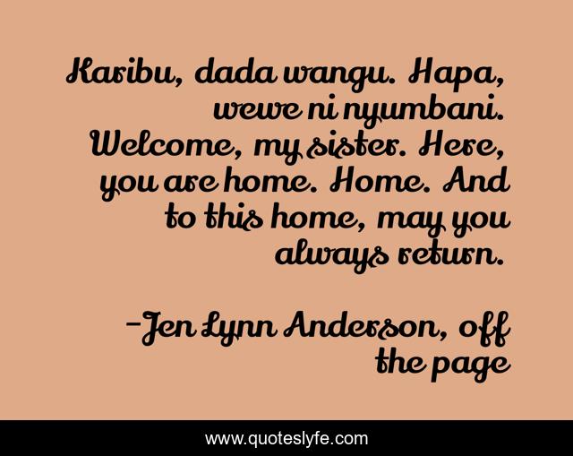 This page presents the quote "Karibu, dada wangu. Hapa, wewe ni nyumbani. Welcome, my sister. Here, you are home. Home. And to this home, may you always return.". Author of this quote is Jen Lynn Anderson, off the page. .