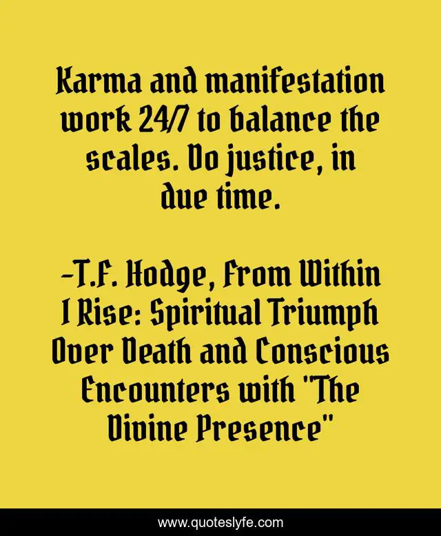 "T.F. Hodge, From Within I Rise: Spiritual Triumph Over Death and Conscious Encounters with "The Divine Presence" Quotes." Quoteslyfe.com, 2025. Mon. 08 Dec. 2025. <https://www.quoteslyfe.com/quote/Karma-and-manifestation-work-24-7-to-176571>.