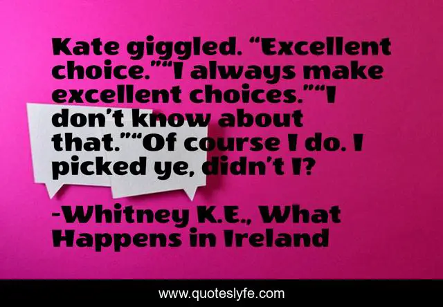 "Whitney K.E., What Happens in Ireland Quotes." Quoteslyfe.com, 2025. Fri. 05 Dec. 2025. <https://www.quoteslyfe.com/quote/Kate-giggled-Excellent-choice-I-always-make-212719>.