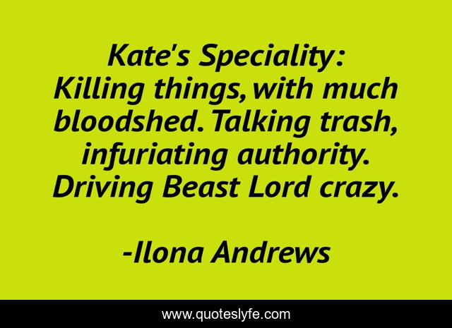 This page presents the quote "Kate's Speciality: Killing things, with much bloodshed. Talking trash, infuriating authority. Driving Beast Lord crazy.". Author of this quote is Ilona Andrews. This quote is about funny, kate-daniels, comedy, ilona-andrews-website, magic-bleeds,.