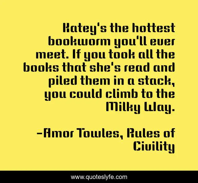 This page presents the quote "Katey's the hottest bookworm you'll ever meet. If you took all the books that she's read and piled them in a stack, you could climb to the Milky Way.". Author of this quote is Amor Towles, Rules of Civility. This quote is about books, reading,.