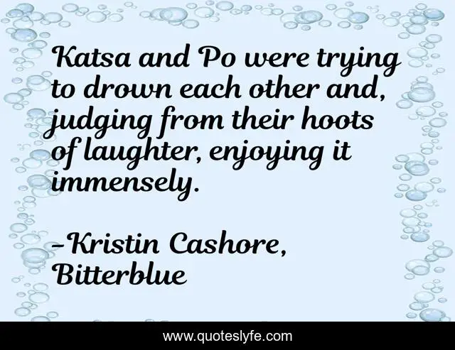 This page presents the quote "Katsa and Po were trying to drown each other and, judging from their hoots of laughter, enjoying it immensely.". Author of this quote is Kristin Cashore, Bitterblue. This quote is about bitterblue, katsa, humor, po,.
