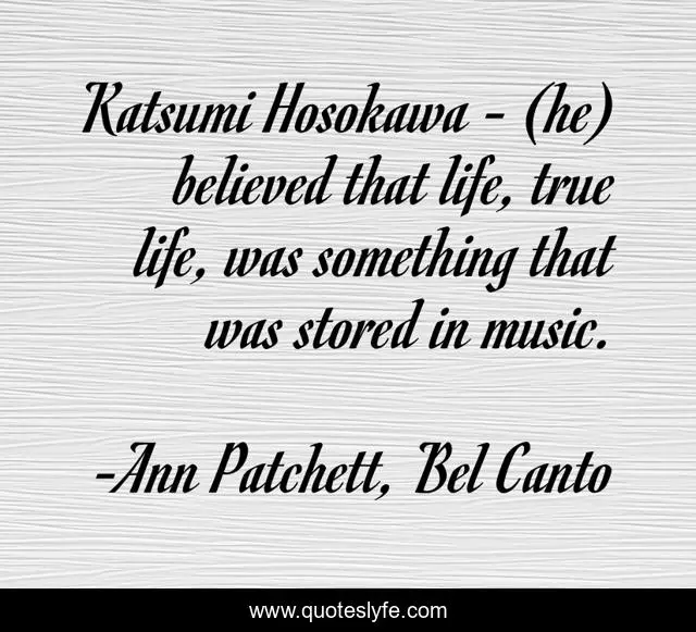 This page presents the quote "Katsumi Hosokawa - (he) believed that life, true life, was something that was stored in music.". Author of this quote is Ann Patchett, Bel Canto. This quote is about ann-patchett, life, music, bel-canto,.