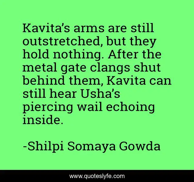 This page presents the quote "Kavita’s arms are still outstretched, but they hold nothing. After the metal gate clangs shut behind them, Kavita can still hear Usha’s piercing wail echoing inside.". Author of this quote is Shilpi Somaya Gowda. This quote is about longing, abandonment, loss,.