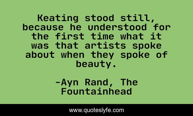 This page presents the quote "Keating stood still, because he understood for the first time what it was that artists spoke about when they spoke of beauty.". Author of this quote is Ayn Rand, The Fountainhead. This quote is about art, beauty,.