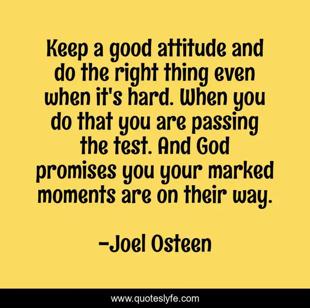 This page presents the quote "Keep a good attitude and do the right thing even when it's hard. When you do that you are passing the test. And God promises you your marked moments are on their way.". Author of this quote is Joel Osteen. This quote is about moments, god, good,.