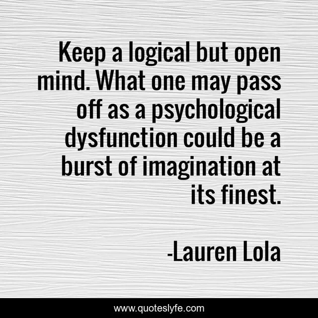 This page presents the quote "Keep a logical but open mind. What one may pass off as a psychological dysfunction could be a burst of imagination at its finest.". Author of this quote is Lauren Lola. This quote is about open-mindedness, contemporary,.