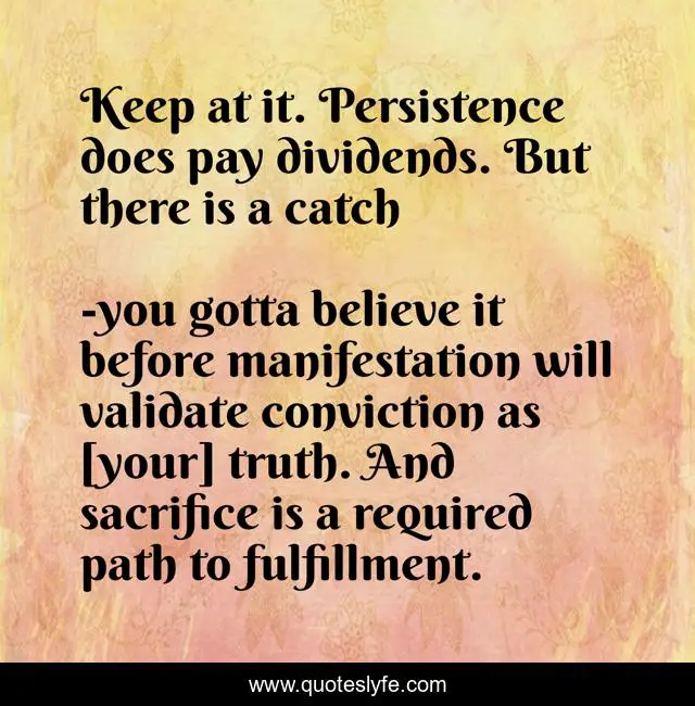 "you gotta believe it before manifestation will validate conviction as [your] truth. And sacrifice is a required path to fulfillment. Quotes." Quoteslyfe.com, 2025. Sat. 06 Dec. 2025. <https://www.quoteslyfe.com/quote/Keep-at-it-Persistence-does-pay-dividends-111633>.