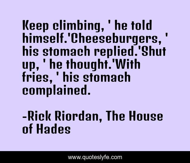 This page presents the quote "Keep climbing, ' he told himself.'Cheeseburgers, ' his stomach replied.'Shut up, ' he thought.'With fries, ' his stomach complained.". Author of this quote is Rick Riordan, The House of Hades. This quote is about percy-jackson, tartarus, underworld, starved, hunger,.