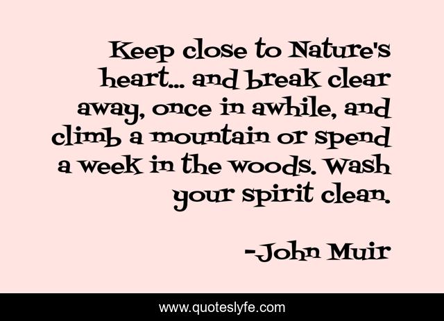 This page presents the quote "Keep close to Nature's heart... and break clear away, once in awhile, and climb a mountain or spend a week in the woods. Wash your spirit clean.". Author of this quote is John Muir. This quote is about mountain, environmental,.