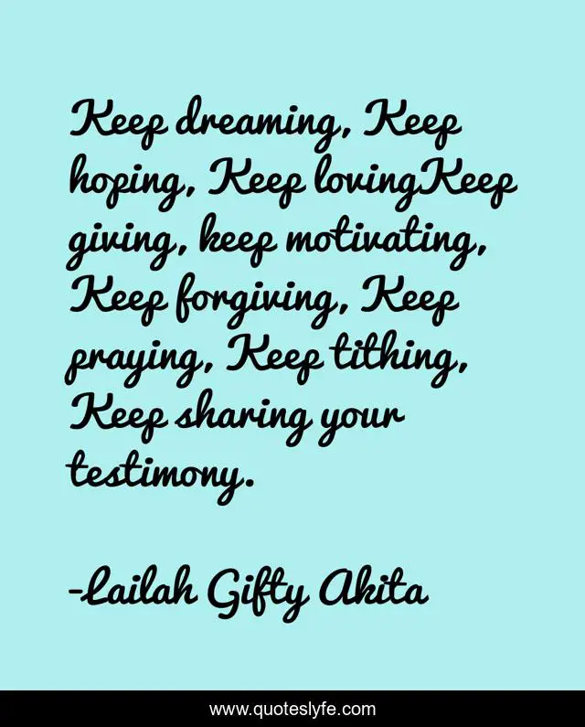 "Lailah Gifty Akita Quotes." Quoteslyfe.com, 2025. Sun. 07 Dec. 2025. <https://www.quoteslyfe.com/quote/Keep-dreaming-Keep-hoping-Keep-lovingKeep-giving-122096>.