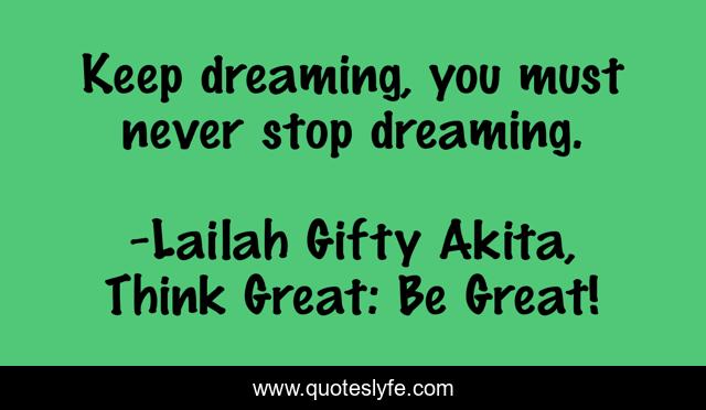 "Lailah Gifty Akita, Think Great: Be Great! Quotes." Quoteslyfe.com, 2025. Mon. 08 Dec. 2025. <https://www.quoteslyfe.com/quote/Keep-dreaming-you-must-never-stop-dreaming-208377>.