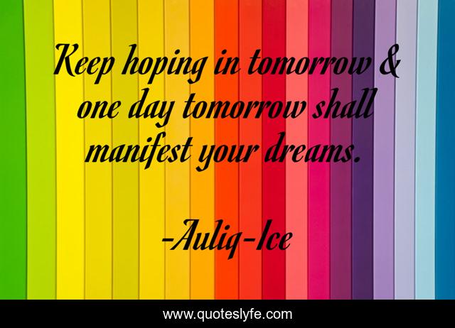 This page presents the quote "Keep hoping in tomorrow & one day tomorrow shall manifest your dreams.". Author of this quote is Auliq-Ice. This quote is about chasing-dreams, dreams-come-true, hopes-and-dreams, hope, hopes, change,.