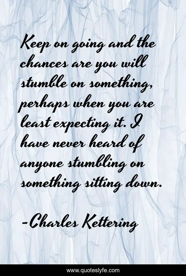 This page presents the quote "Keep on going and the chances are you will stumble on something, perhaps when you are least expecting it. I have never heard of anyone stumbling on something sitting down.". Author of this quote is Charles Kettering. .