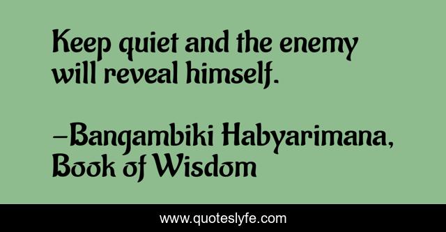 This page presents the quote "Keep quiet and the enemy will reveal himself.". Author of this quote is Bangambiki Habyarimana, Book of Wisdom. This quote is about enemy, enemies-trap, enemies-and-opposition, quietness, quiet-time, foe, enemies,.