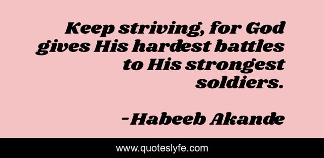 This page presents the quote "Keep striving, for God gives His hardest battles to His strongest soldiers.". Author of this quote is Habeeb Akande. This quote is about confidence, god, motivational, optimistic, inspirational, positive, enthusiasm, religious,.